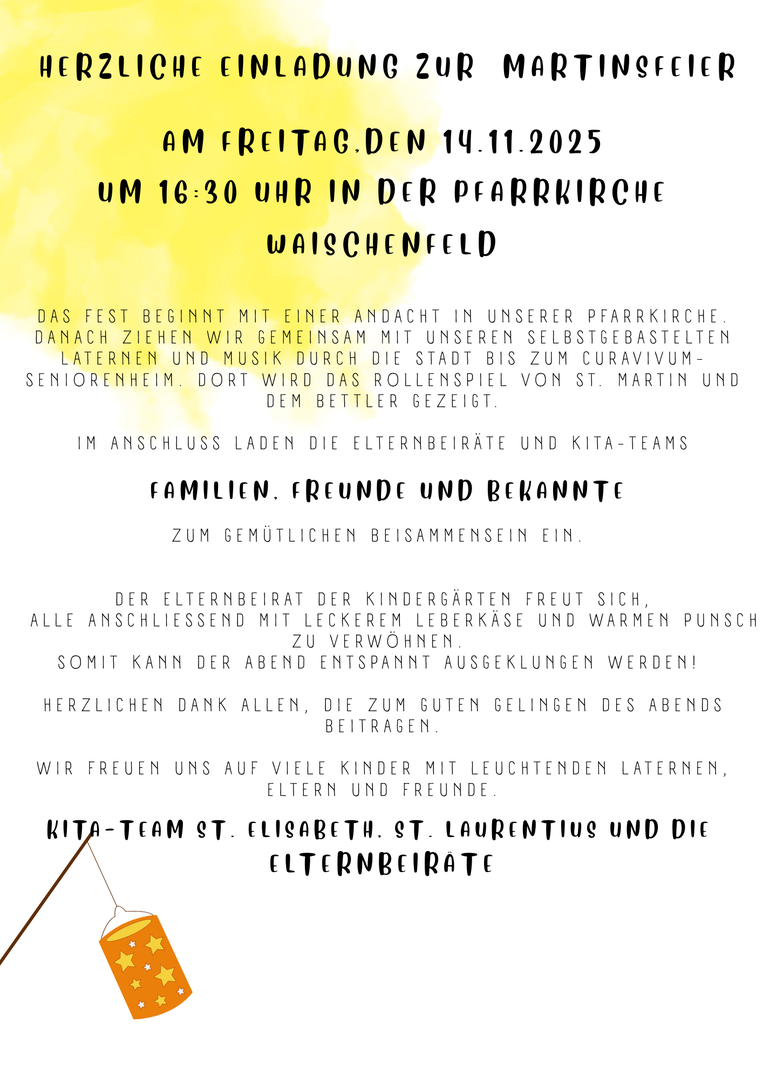 Wir feiern das Fest des Hl. Martin und freuen uns, wenn Sie dabei sind.Nach einer Andacht in der Kirche ziehen wir mit den Laternen und Musik hinter St. Martin mit dem Pferd durch die Stadt bis zum CuraVivum-Seniorenheim. Dort wird das Rollenspiel von St. Martin und dem Bettler gezeigt, wir singen gemeinsam und lassen die Andacht ausklingen.